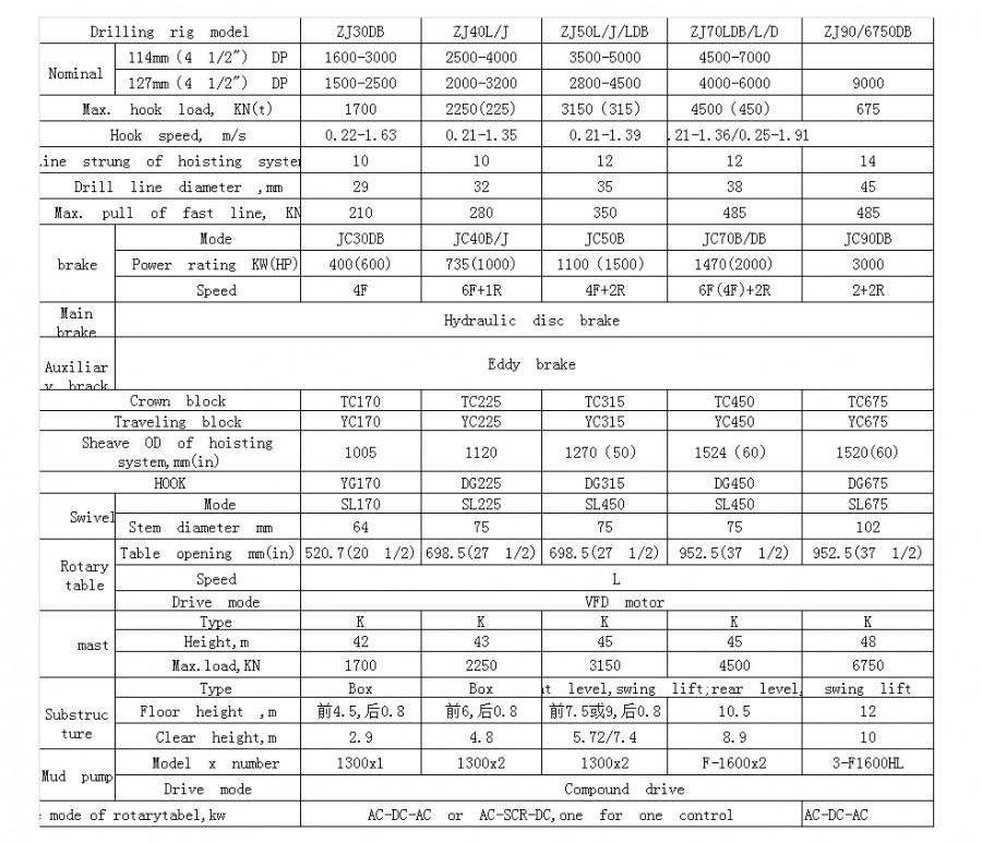 Drilling Rig overview Drilling Rig system Characteristics of complete sets of rigs: 1. Open company currently mainly design and manufacturing 1000-9000 meters mechanical or electric land drilling rigs and offshore drilling rigs module; 2. drilling rig derrick and substructure system has slingshot, integral lifting, helicopter, boot-strap, vertical raise and fall type, block type and tower type equipment various forms of products for users to choose; 3. Drawworks system can choose traditional belt transmission, chain transmission, but also choose advanced gear transmission, and bailing drum and automatic drilling device is optional; 4. Digital drilling control system in AC / DC two ways, any kind of way can achieve full torque braking energy. Model and parameters of Drilling